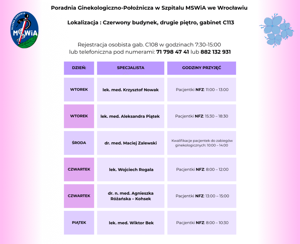 Kontakt: 882 132 931, mail: poradniaginekologiczna@spzozmswia.wroclaw.pl